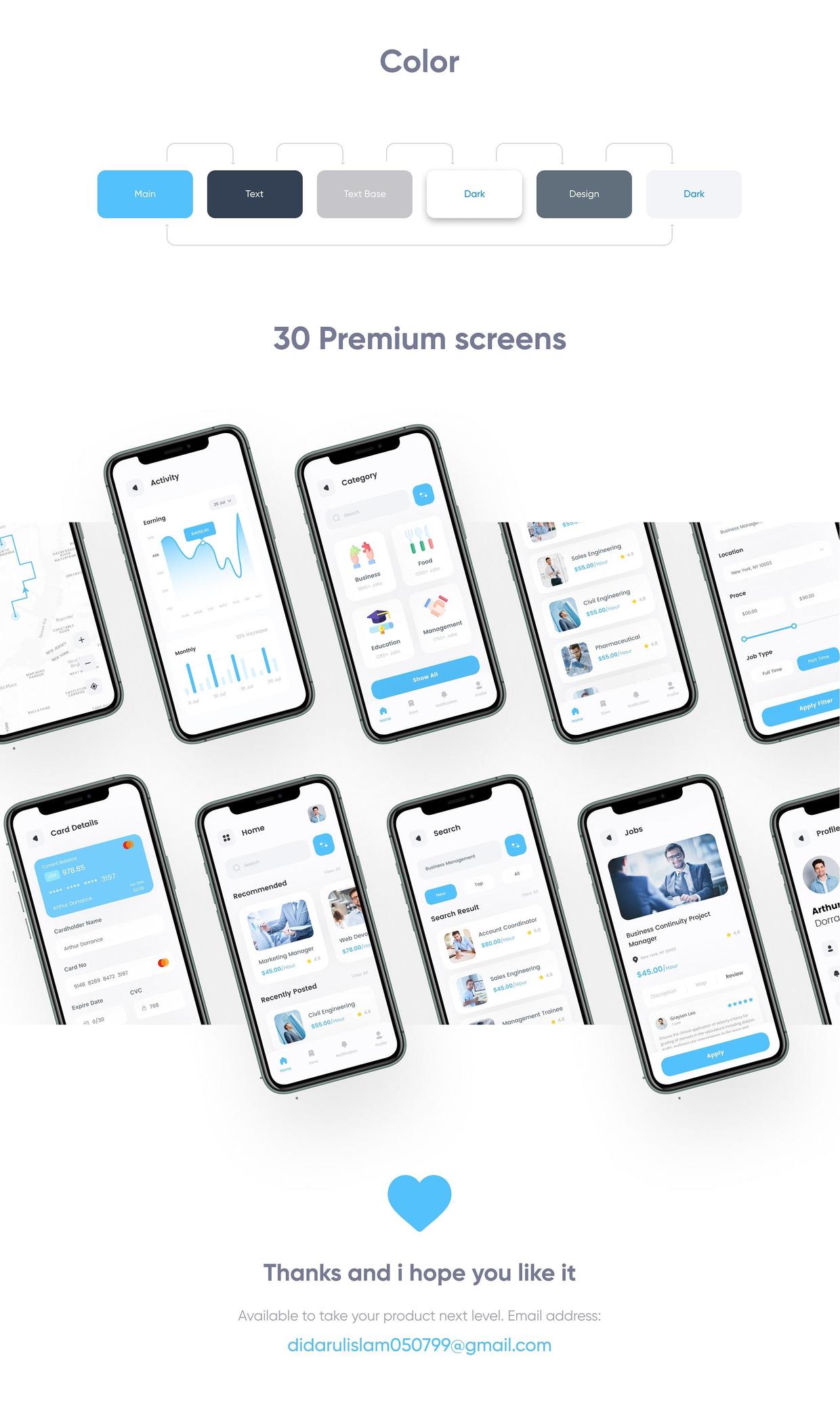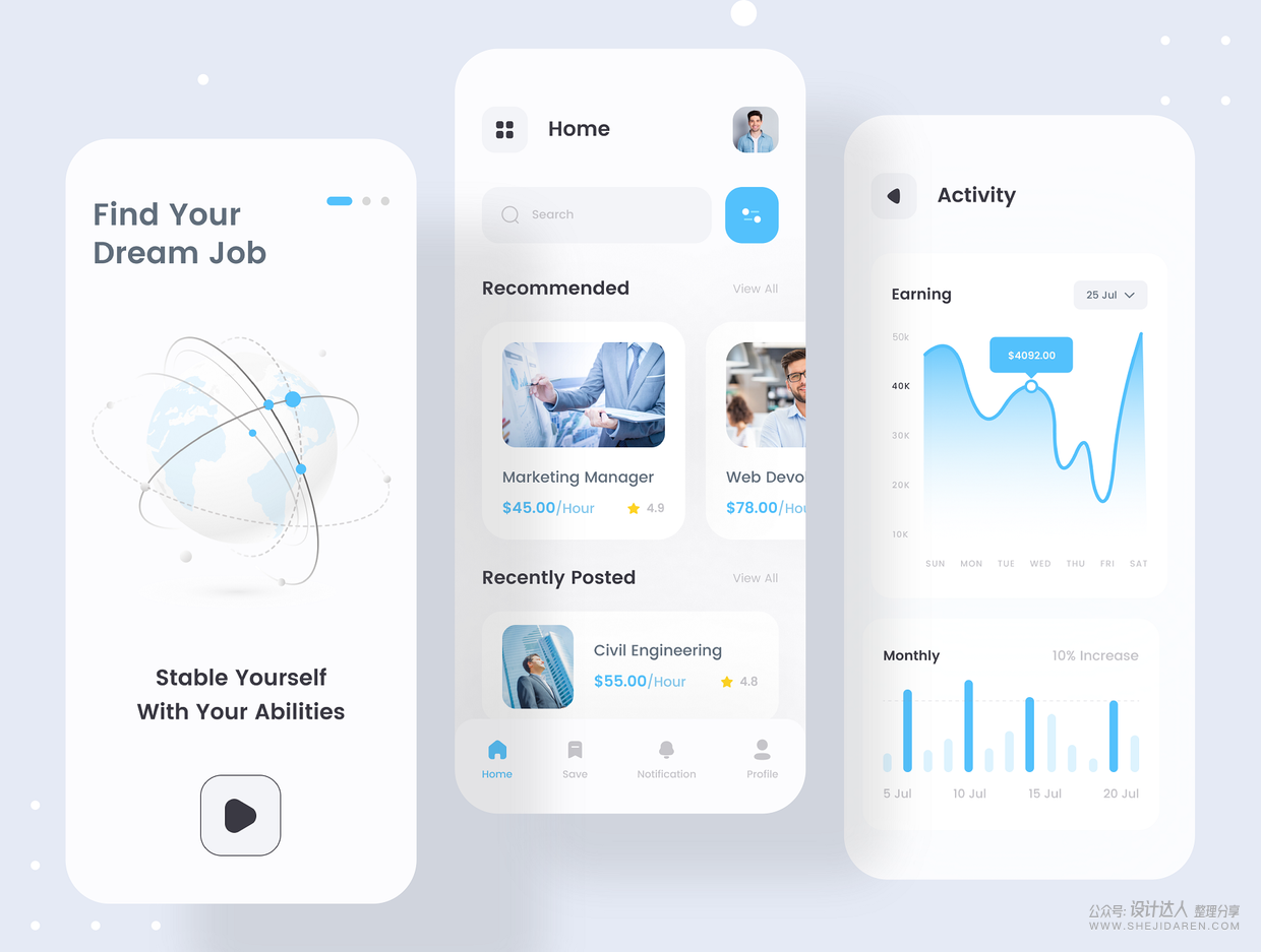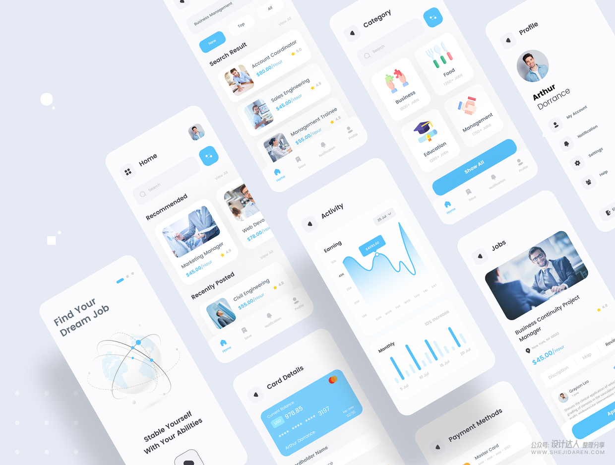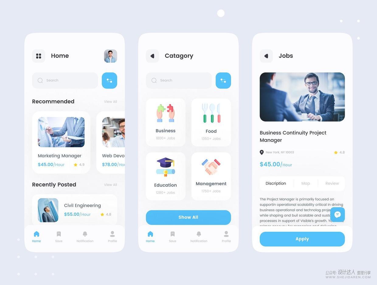 这是一款界面设计很好的求职应用。主要用于专业网络,包括雇主和求职者张贴他们的简历。免费访问数百万条招聘信息,个性化搜索,联系雇主并提交工作申请。包括Figma,Adobe XD,Sketch文件的高级应用程序。