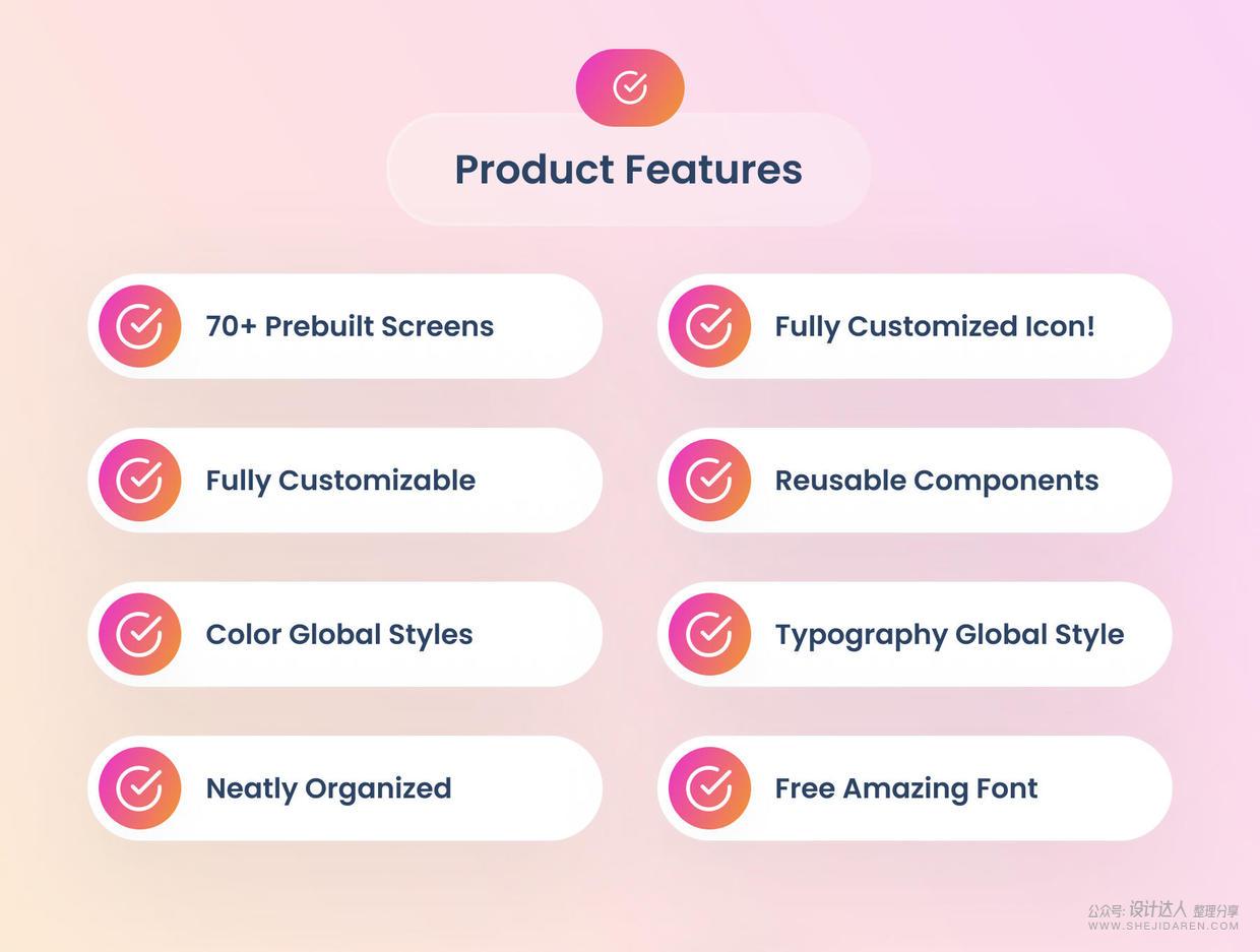 Ayton是一个加密钱包应用程序UI套件,具有简洁时尚的风格,包含70多个高质量的屏幕,具有响应性调整大小功能,适用于iPhone X/11 Pro屏幕尺寸(375px X 812px)的iOS,全局颜色和文本样式,以及Google Fonts (Poppins)的免费字体系列。支持Figma和在线编辑。