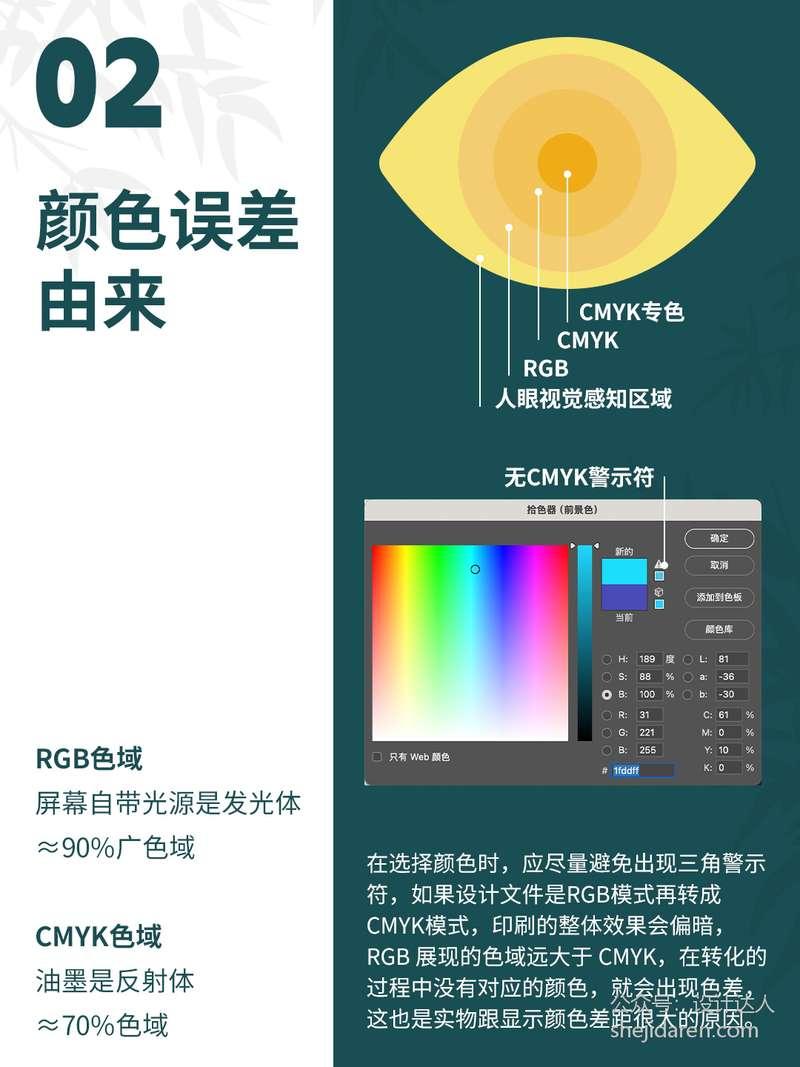 - 人眼视觉感知区域会导致 RGB 和 CMYK 在颜色呈现上有差异。