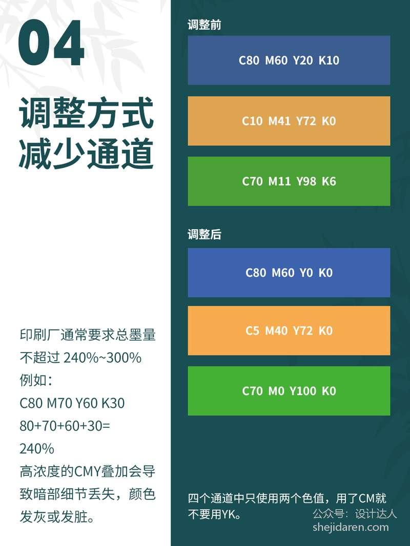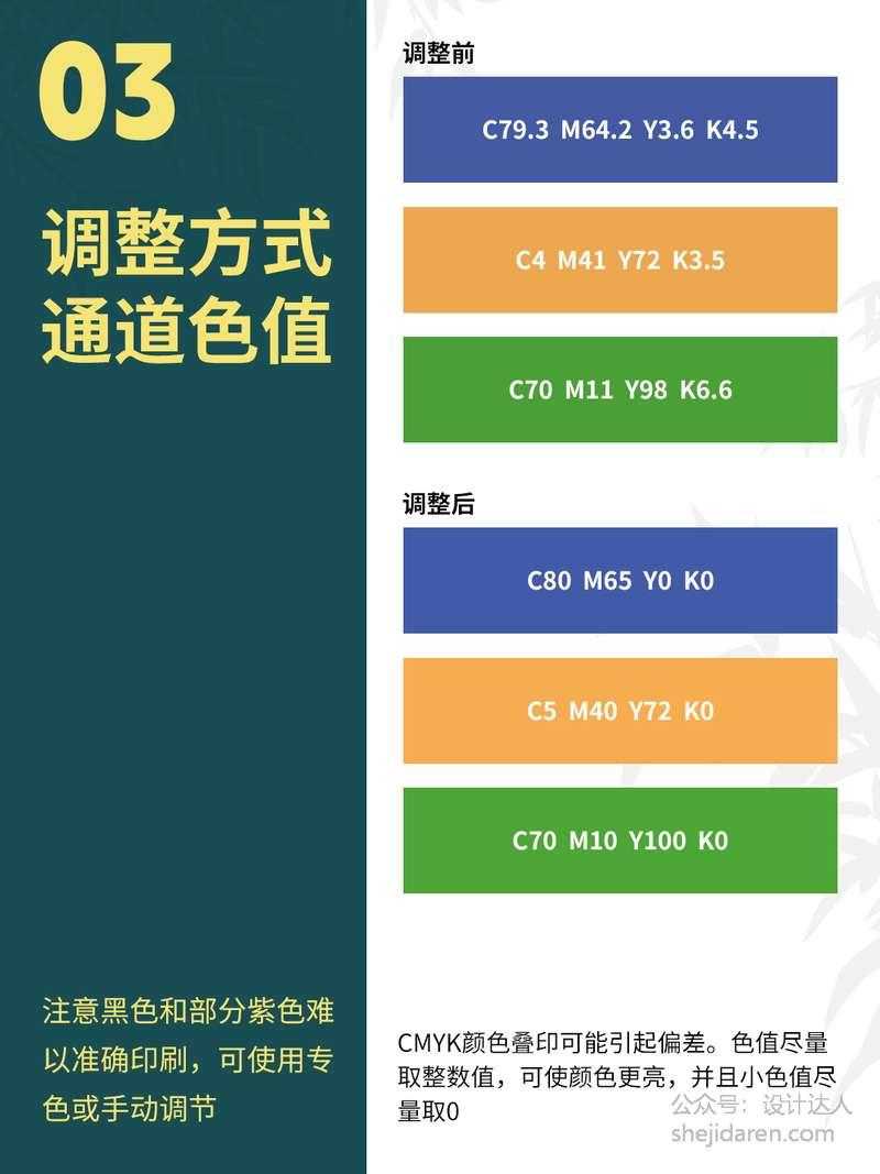 - 例如调整前 C79.3 M64.2 Y3.6 K4.5,调整后 C80 M65 Y0 K0 等,注意黑色和部分紫色难以准确印刷,可使用专色或手动调节。