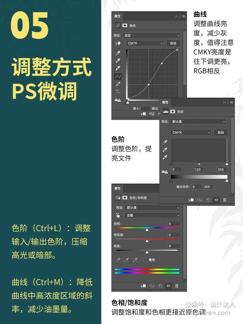 曲线:调整曲线亮度,减少灰度。曲线(Ctrl + M)可以降低曲线中高浓度区域的斜率,减少油墨量。需要注意的是,CMYK 亮度是往下调更亮,RGB 相反。