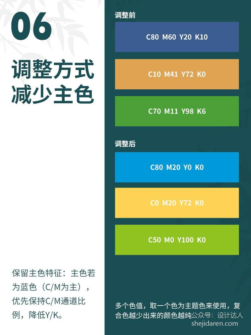 保留主色特征:主色若为蓝色(C/M 为主),优先保持 C/M 通道比例,降低 Y/K。多个色值时,取一个色为主题色来使用,复合色越少出来的颜色越纯。