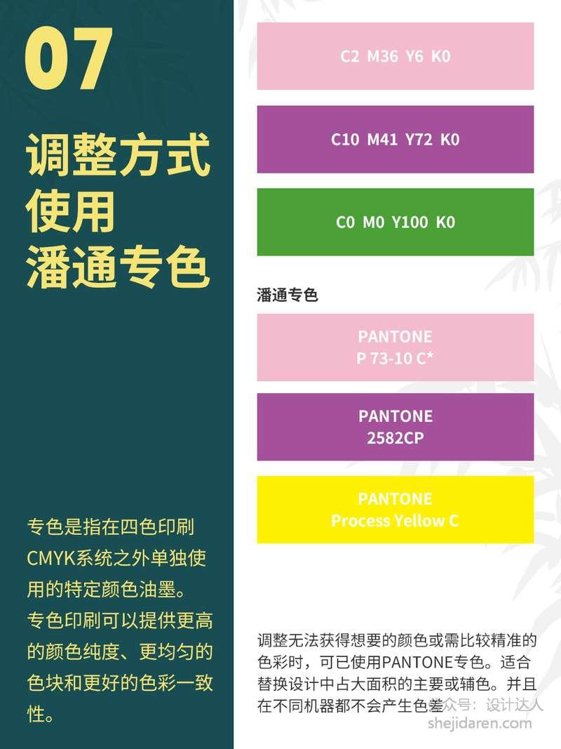当调整无法获得想要的颜色或需比较精准的色彩时,可使用 PANTONE 专色。专色印刷可以提供更高的颜色纯度、更均匀的色块和更好的色彩一致性。适合替换设计中占大面积的主要或辅色,并且在不同机器都不会产生色差。