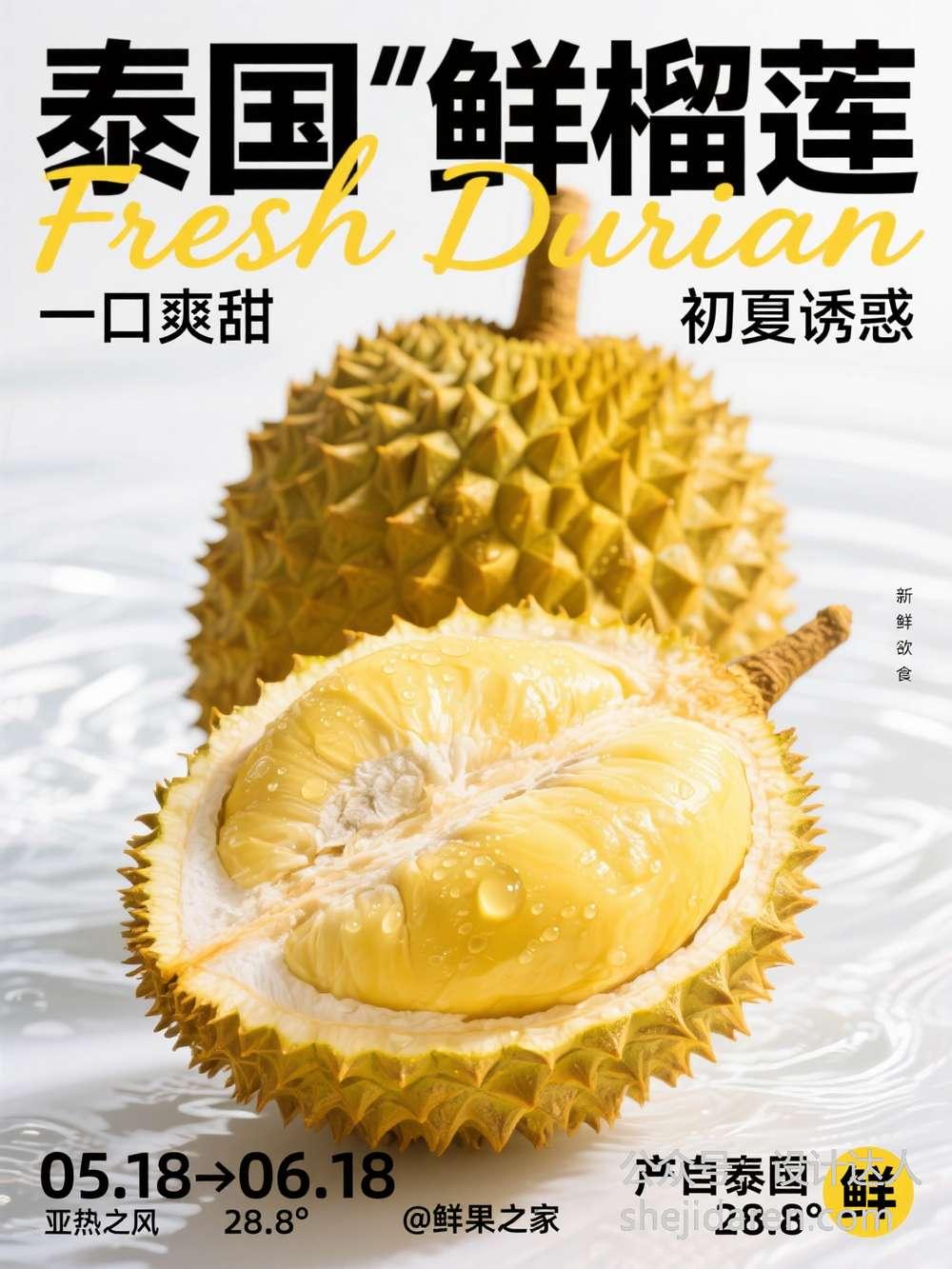 比如针对泰国鲜榴莲,提示词可以从主体内容(榴莲的形态、果肉、刺等)、场景设定(与榴莲相关的文字元素)、风格参考(美食摄影与海报设计风格)这些角度来写。