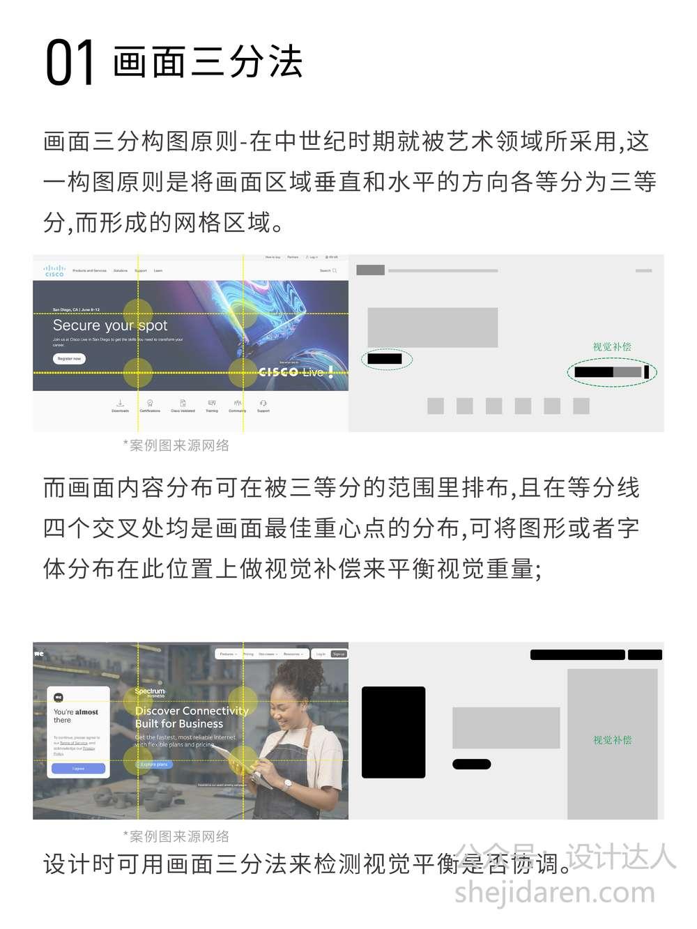 在这个网格中,四个等分线的交叉处可是画面的最佳重心点。我们可以将图形或者字体分布在这些位置上,通过这样的视觉补偿来平衡画面的视觉重量。而且,在设计过程中,我们还能利用画面三分法来检测视觉平衡是否协调,堪称设计中的 “平衡检测仪”。
