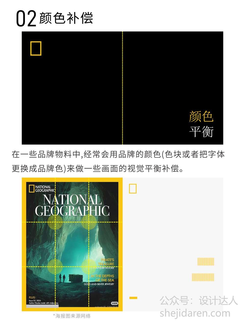 在品牌物料设计中,颜色补偿是常用的手段。我们常常会运用品牌的颜色,无论是色块形式,还是将字体更换成品牌色,以此来实现画面的视觉平衡补偿。