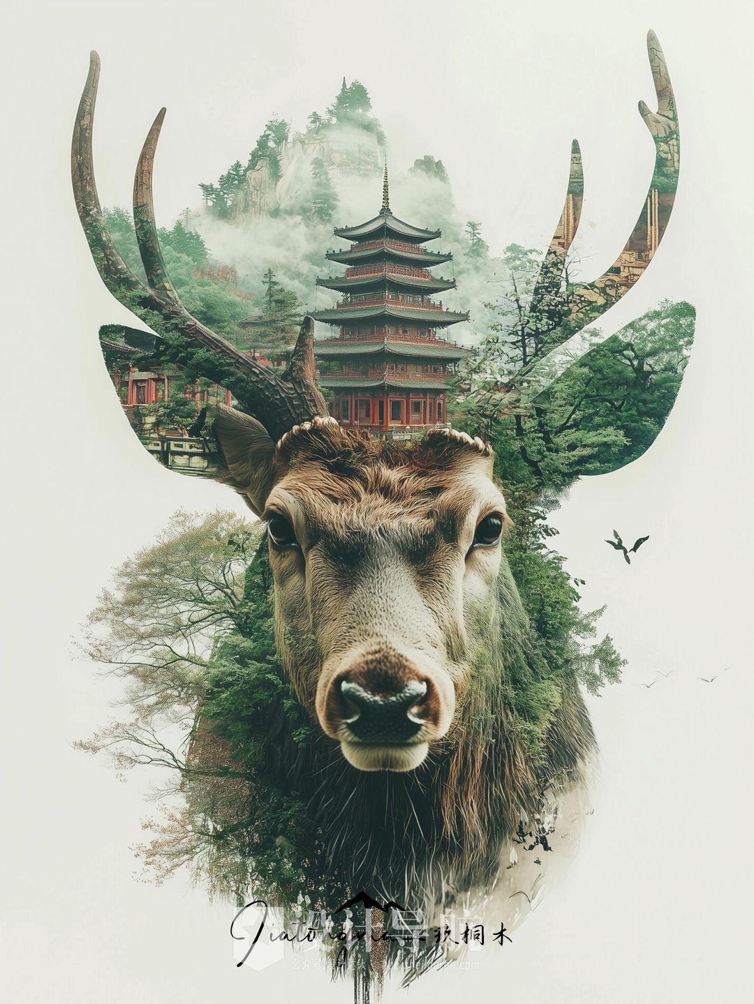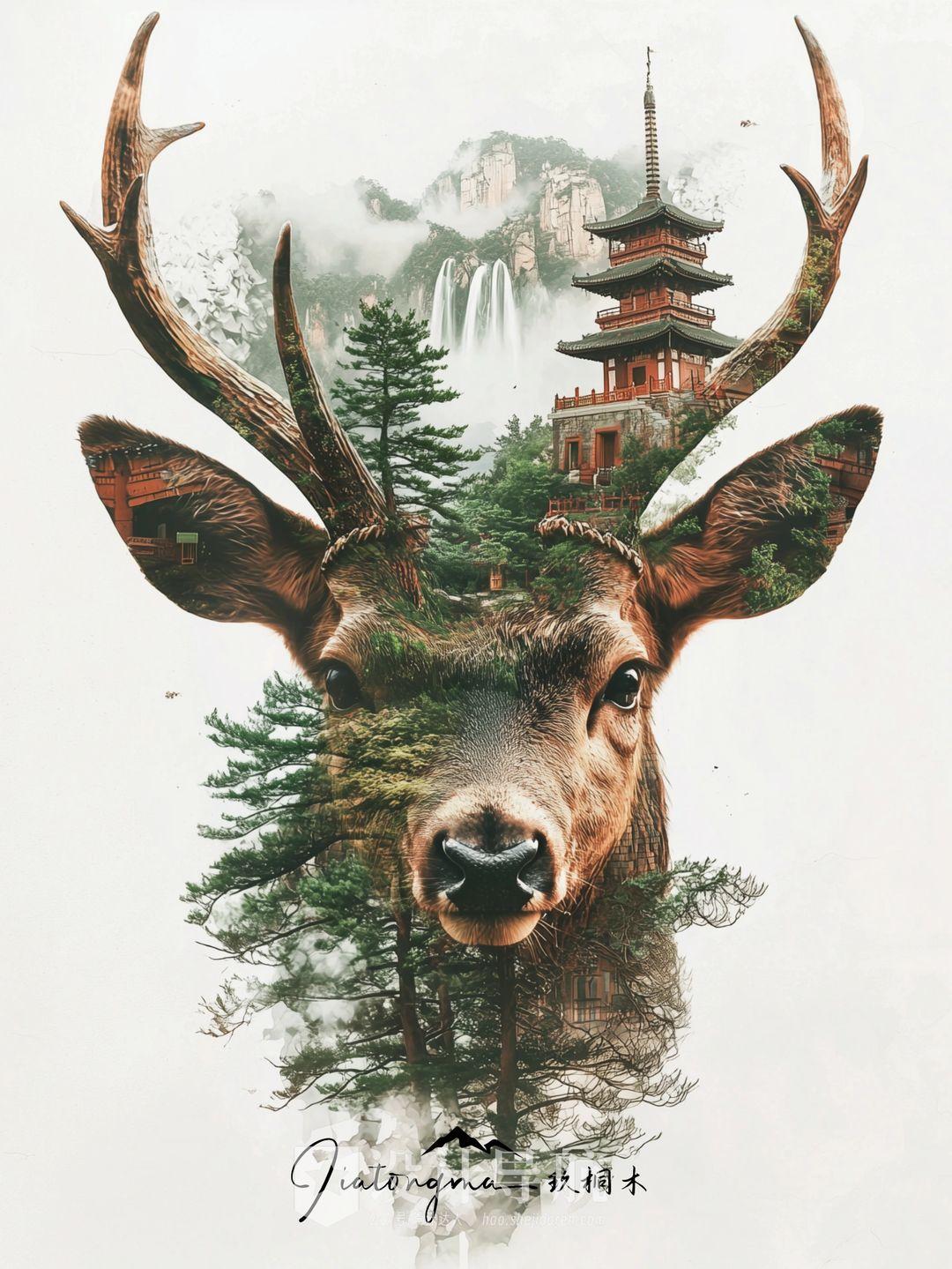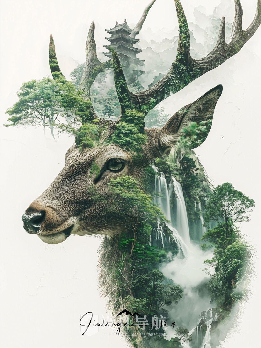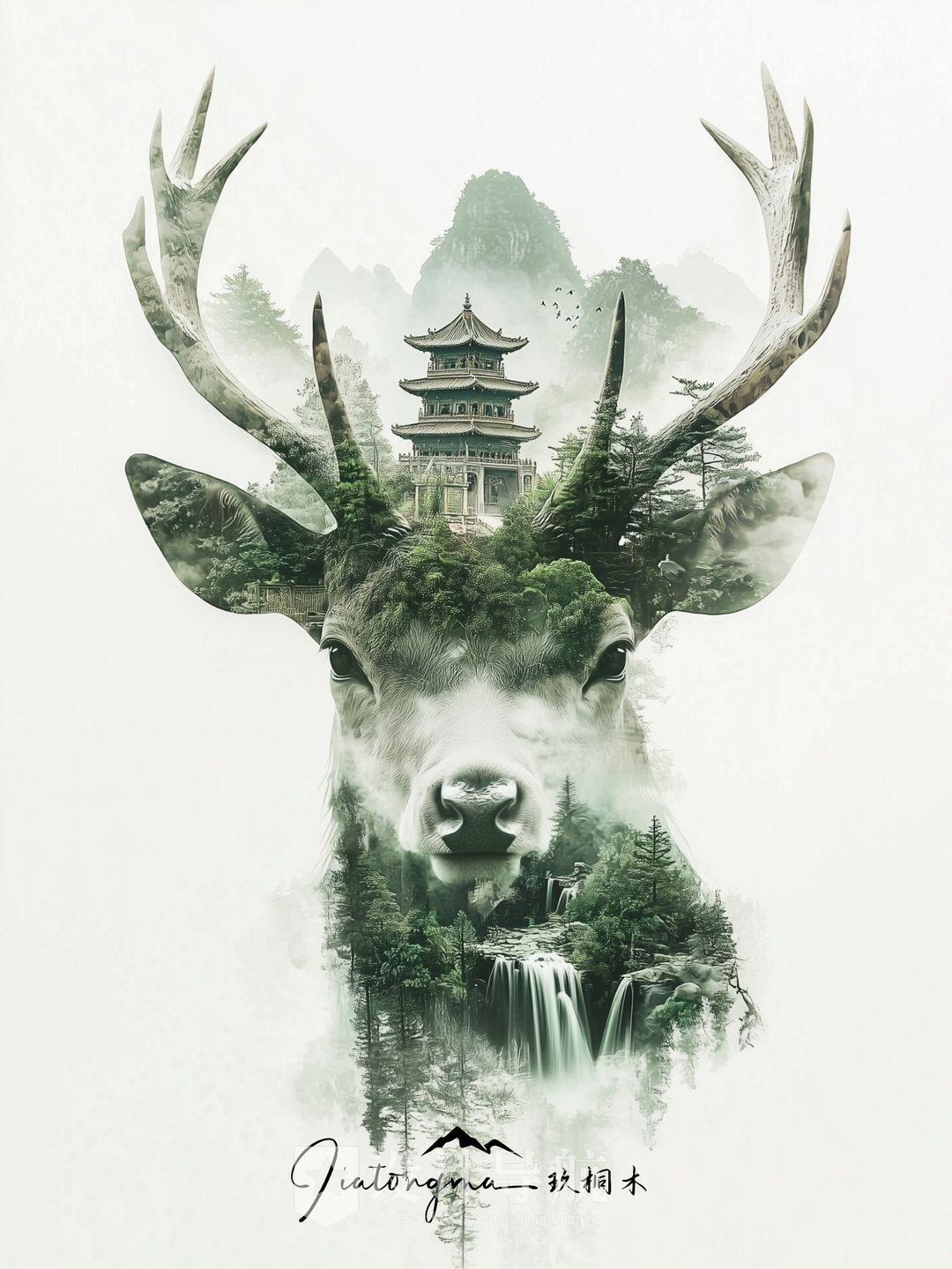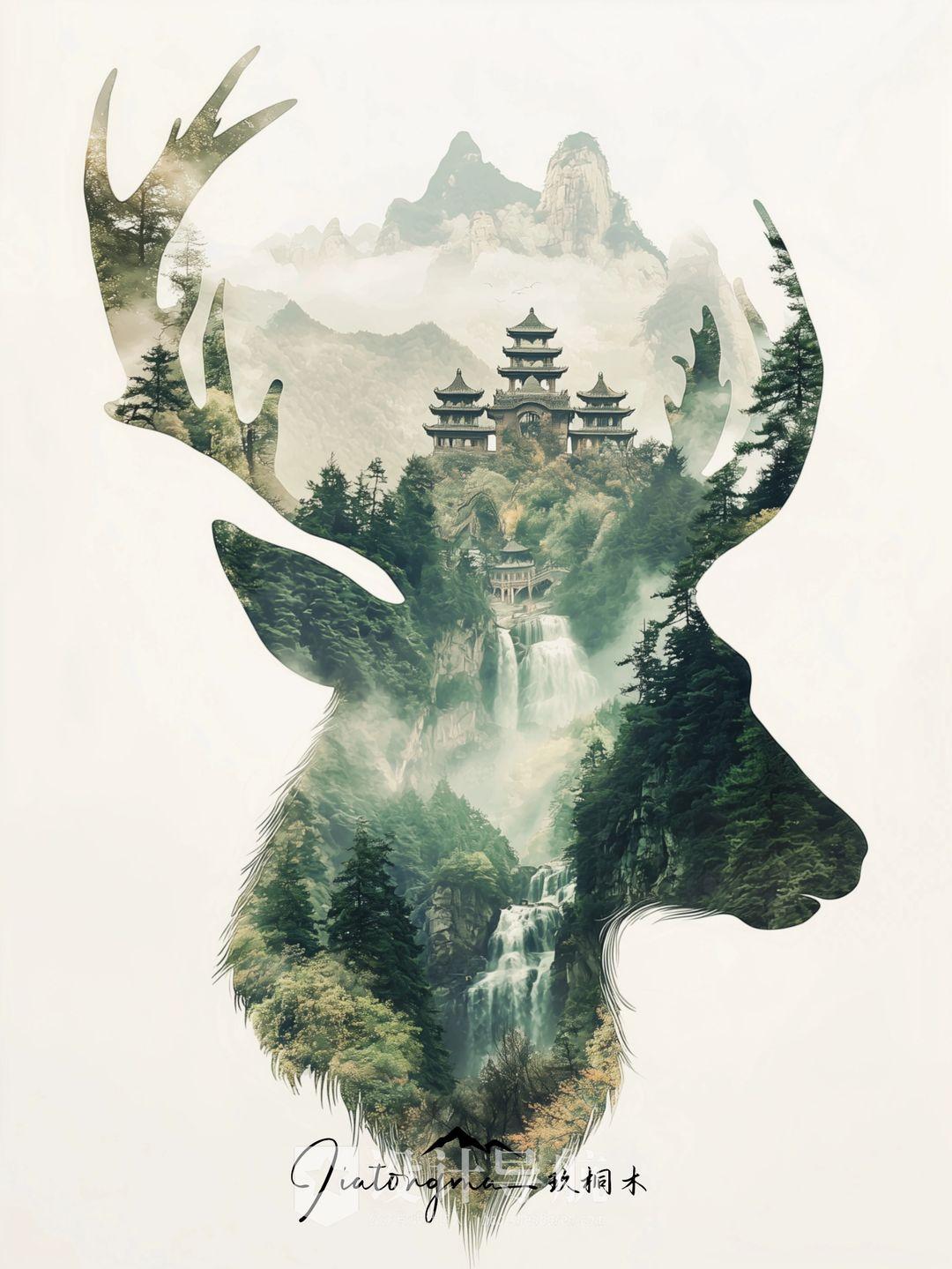 Double exposure illustrations of Asian-style deer heads with antlers and temples, mountains, waterfalls and green trees双重曝光插图的亚洲风格的鹿头与鹿角和寺庙,山脉,瀑布,绿树;