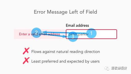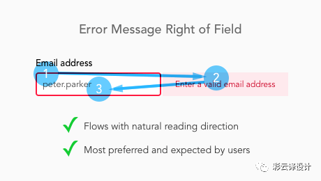 西方的阅读习惯是从左到右。当用户视线从输入到错误反馈,这是一个非常自然的过程,不需要动脑。从看到错误信息提示到输入改正错误,也需要遵循阅读习惯。