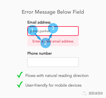 当用户阅读文本时,他们的视线是从左到右、从上到下地看。错误信息提示在输入框的下方是符合垂直的阅读顺序的。需要注意的是,把错误信息放在输入框下方时,不要与表单项目标题靠的太近,会容易形成干扰。