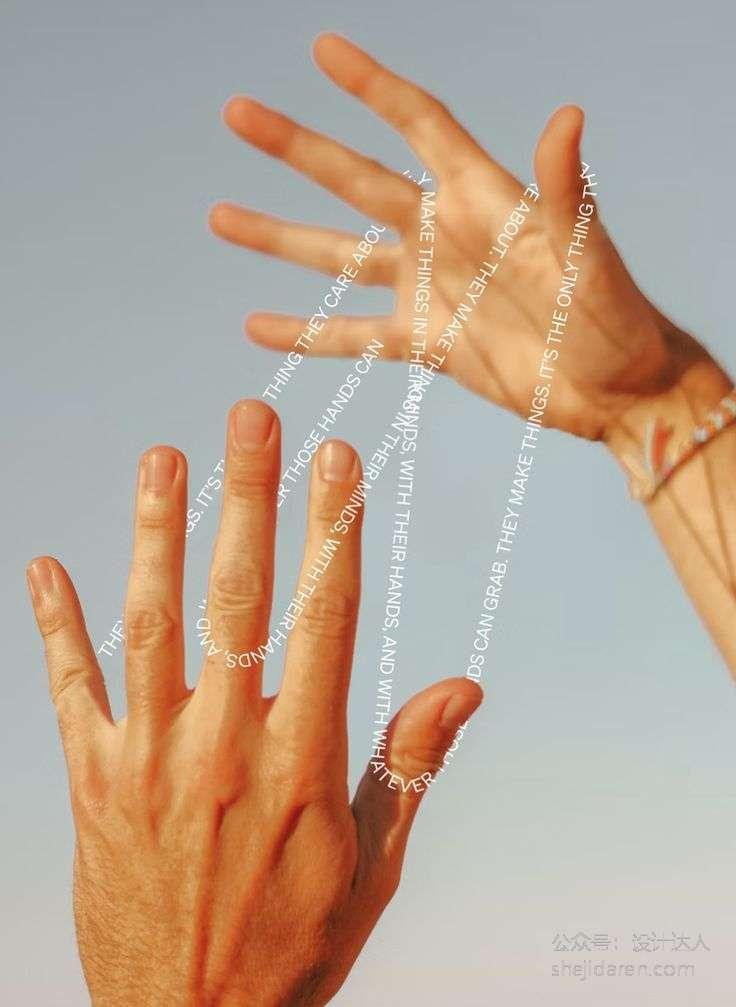 从设计角度来看,文字以斜线的方式排列在手上,形成一种动感和视觉引导,吸引观众的目光沿着手的方向移动。背景是简单的浅蓝色天空,使得手和文字更加突出。整体风格简洁而富有创意,强调了手工创造和个人关注之间的紧密联系。
