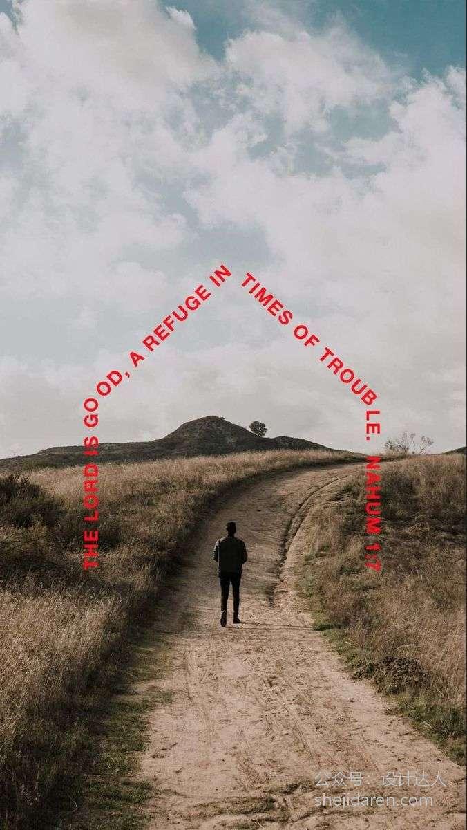 这张海报的背景是一条乡间小路,路的尽头有一个人在行走。天空中有白云,整体氛围宁静。海报上有红色的文字,内容为 “THE LORD IS GOOD, A REFUGE IN TIMES OF TROUBLE. E. NAHUM 1:7”,传达出一种在困境中上帝是避难所的宗教寓意。